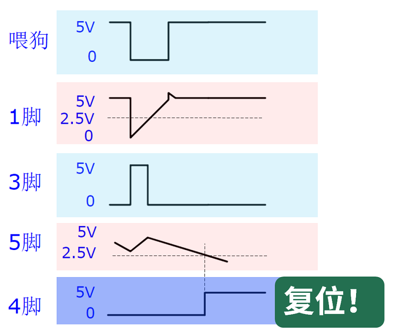 我們需要操作的是在電容C放電至閾值的時(shí)間段內(nèi)給第1引腳一個(gè)低電平,也就是喂狗操作,保證第4引腳持續(xù)輸出低電平,這樣就實(shí)現(xiàn)了看門狗對(duì)電路的監(jiān)控功能。如圖9.