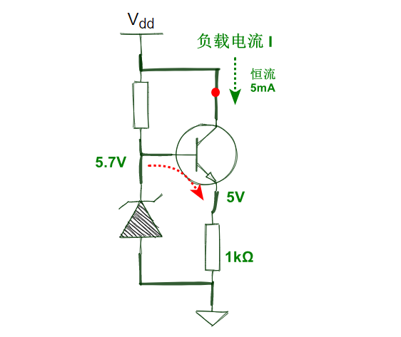 用穩(wěn)壓管穩(wěn)定三極管基電壓,此電壓經(jīng)過發(fā)射結(jié)鉗位之后降低0.7V,此時(shí)發(fā)射極電壓也是穩(wěn)定的,發(fā)射極電壓除以發(fā)射極電阻就得到恒定電流。如圖,在紅點(diǎn)處接負(fù)載,負(fù)載電流恒定為5mA。